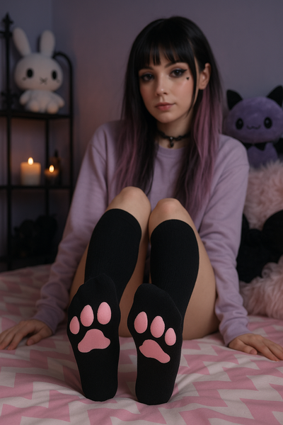 Add a dash of dark-cute energy to your outfit with these Cat Paw Knee-High Socks. Crafted from a soft, stretchy knit, they feature playful pink paw prints on the soles — a secret detail that shows off your kawaii side when you lounge or pose for photos.