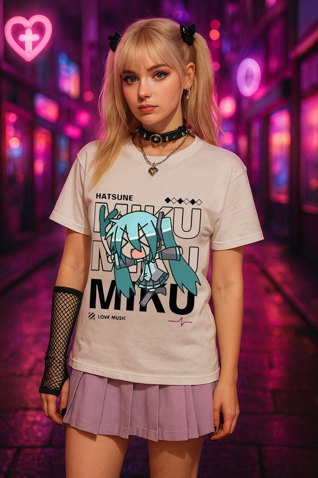 Show your love for everyone’s favourite virtual idol with this sleek Miku-inspired T-shirt, featuring bold “MIKU” lettering in a modern streetwear design. Available in white or black, this tee blends Japanese pop-culture vibes with effortless Harajuku style — perfect for concerts, casual days, or layered fashion looks.