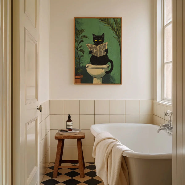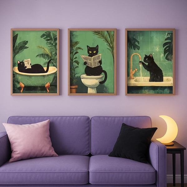 Bring charm, humour, and a touch of artistic flair to your home with this set of 3 black cat posters, each featuring a mischievous kitty caught in a cosy bathroom moment. From soaking in the tub, to reading on the toilet, to washing up at the sink — these prints blend vintage-inspired colours with modern playful character, making them the perfect conversation starters.