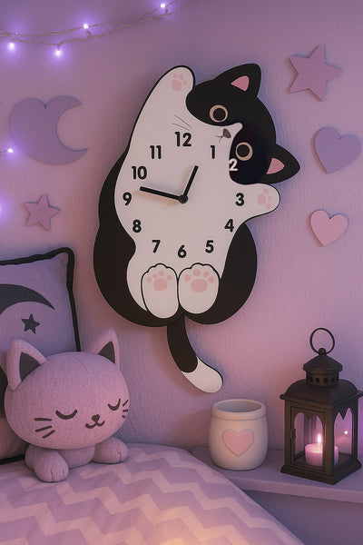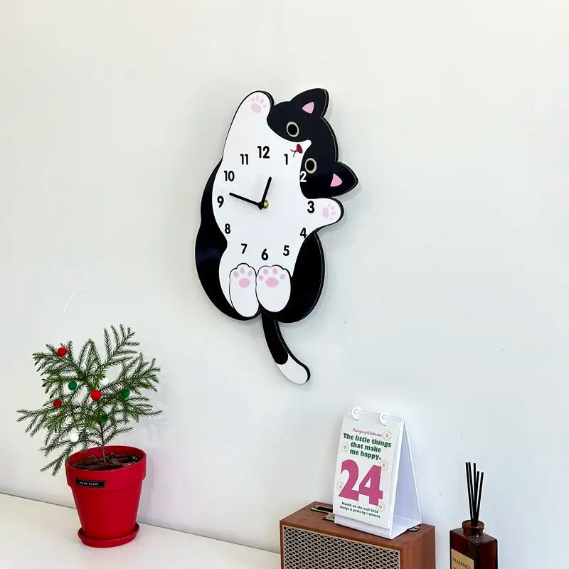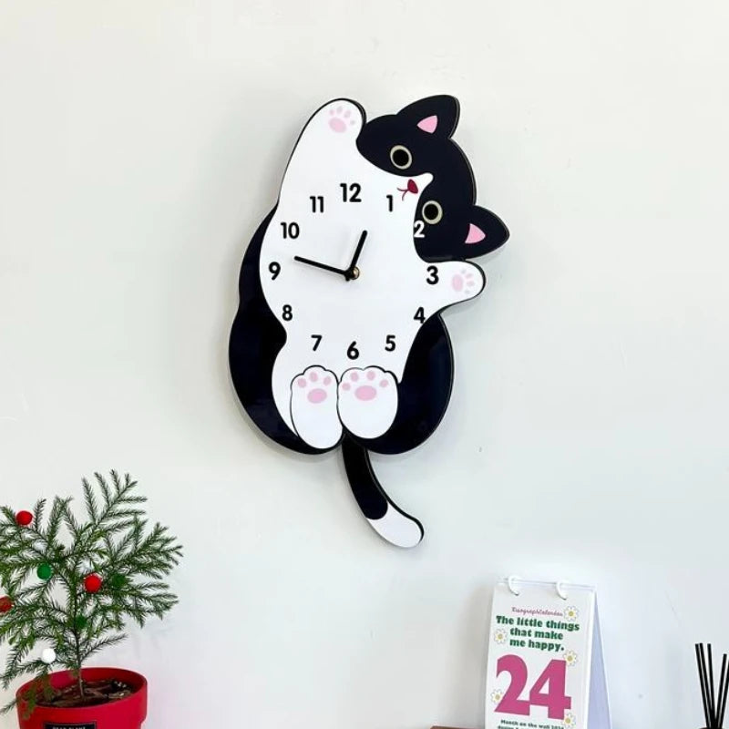 Add a burst of charm to your room with this Swinging Cat Tail Wall Clock, featuring an adorable black-and-white kitty curled up with its paws out and big expressive eyes. The best part? Its swinging tail pendulum, which gently sways back and forth, bringing your wall décor to life with irresistible movement and character.