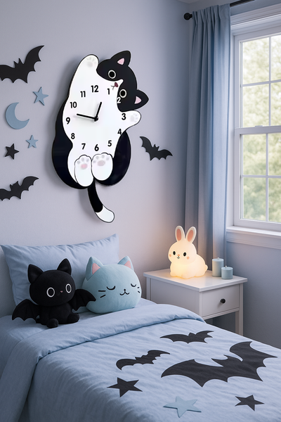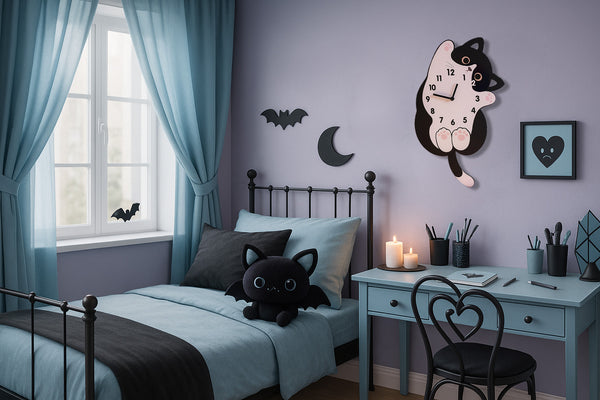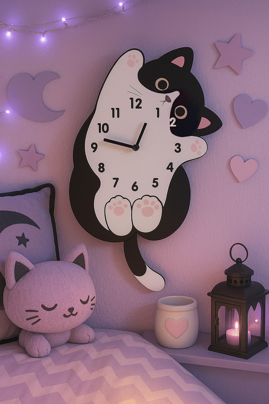 Perfect for bedrooms, studies, living rooms, or kawaii-themed spaces, this clock blends functional design with whimsical style — ideal for cat lovers, pastel goth fans, and anyone who enjoys playful home accents.