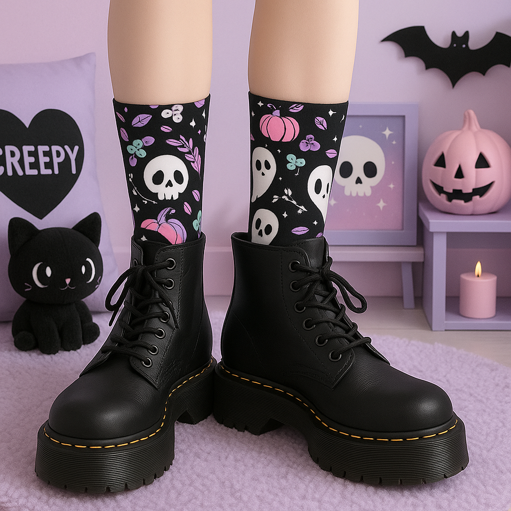 Step into style with these Haunts Crew Socks, featuring a pastel-goth inspired print thatβs equal parts creepy and cute. Perfect for anyone who loves mixing dark aesthetics with playful charm, these socks add just the right touch of attitude to your outfit β whether youβre lounging at home or haunting the streets in style.