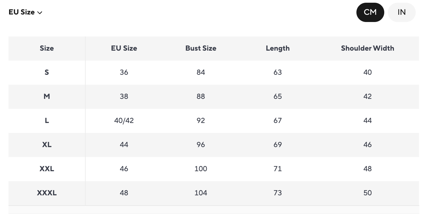| Size | XS, S, M, L, XL, XXL, XXXL |