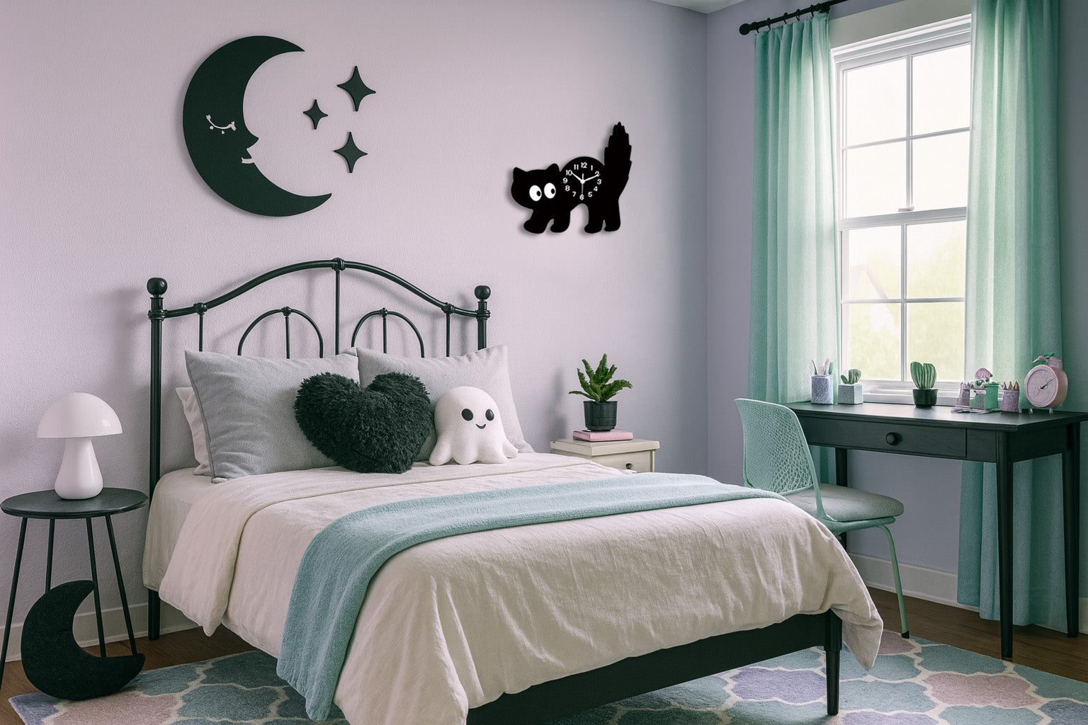 Bring a touch of dark-kawaii charm to your space with this Scaredy Cat Wall Clock, designed in the shape of an adorable wide-eyed black cat. Whether you’re styling a pastel goth bedroom, a cosy study nook, or your aesthetic workspace, this clock adds instant personality with its playful silhouette and bold black finish.